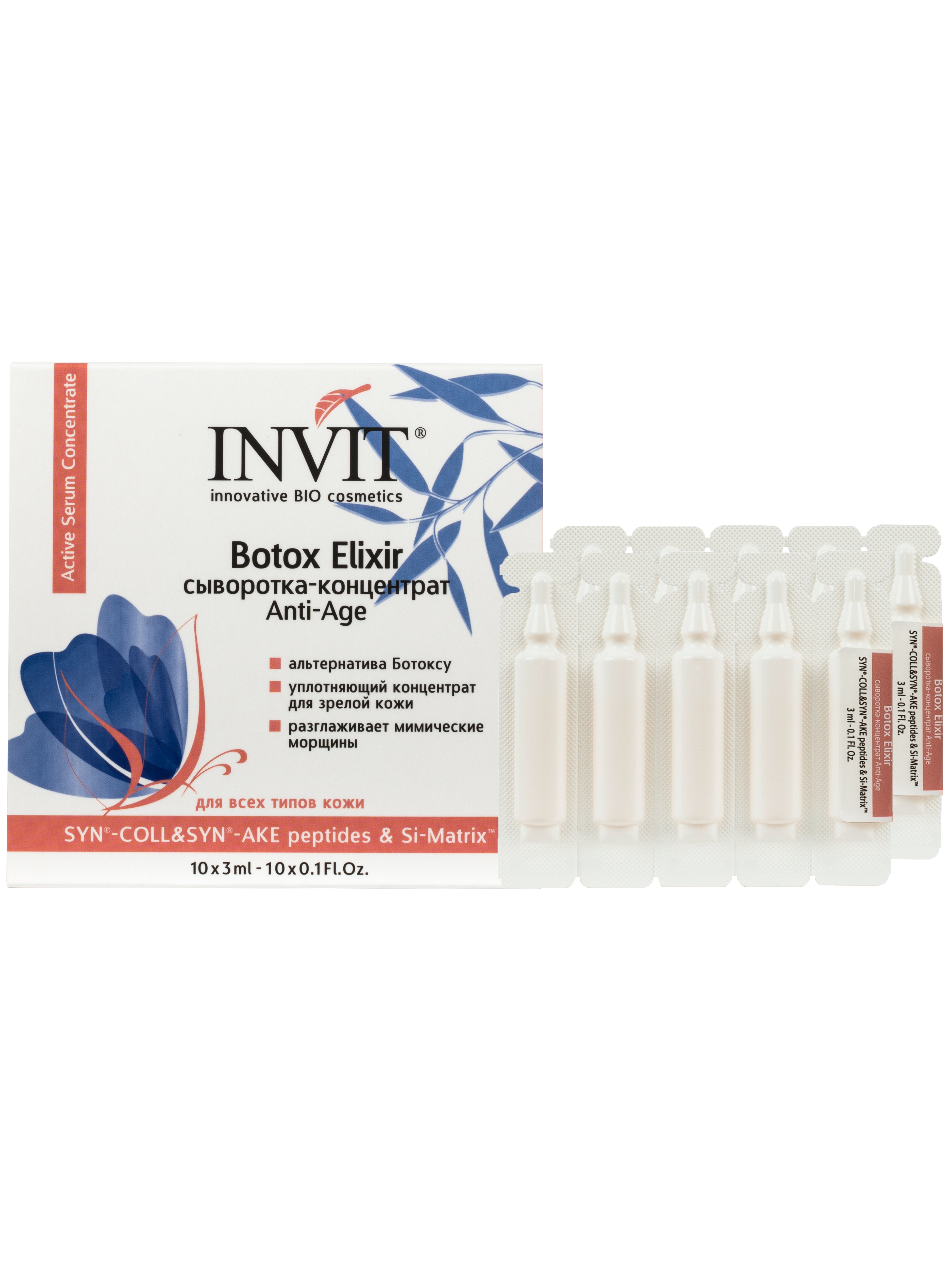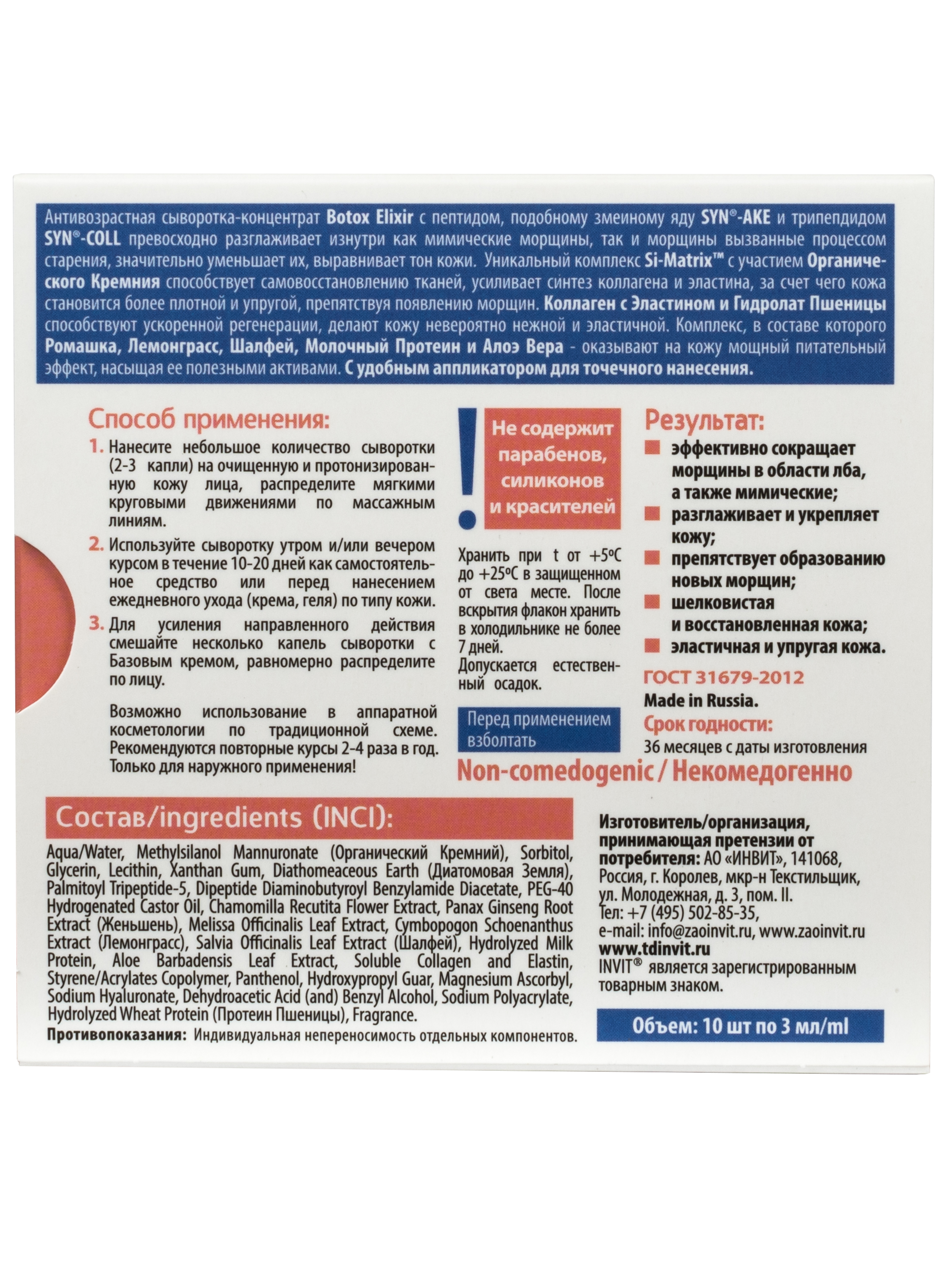 "Сыворотка-концентрат с ботокс эффектом Botox Elixir - антивозрастное средство с пептидом SYN®-AKE и трипепдидом SYN®-COLL, эффективно разглаживает мимические и возрастные морщины, выравнивает тон кожи. Комплекс Si-Matrix™ с участием Органического Кремния способствует самовосстановлению тканей, усиливает синтез коллагена и эластина, делая кожу плотной и упругой. Коллаген с Эластином и Гидролат Пшеницы ускоряют регенерацию, а экстракты Ромашки, Лемонграсса, Шалфея, Молочного Протеина и Алоэ Вера питают и увлажняют кожу. Способ применения: Нанести 2-3 капли на очищенную кожу лица, распределить мягкими движениями. Использовать курсом 10-20 дней, повторять 2-4 раза в год. Только для наружного применения.