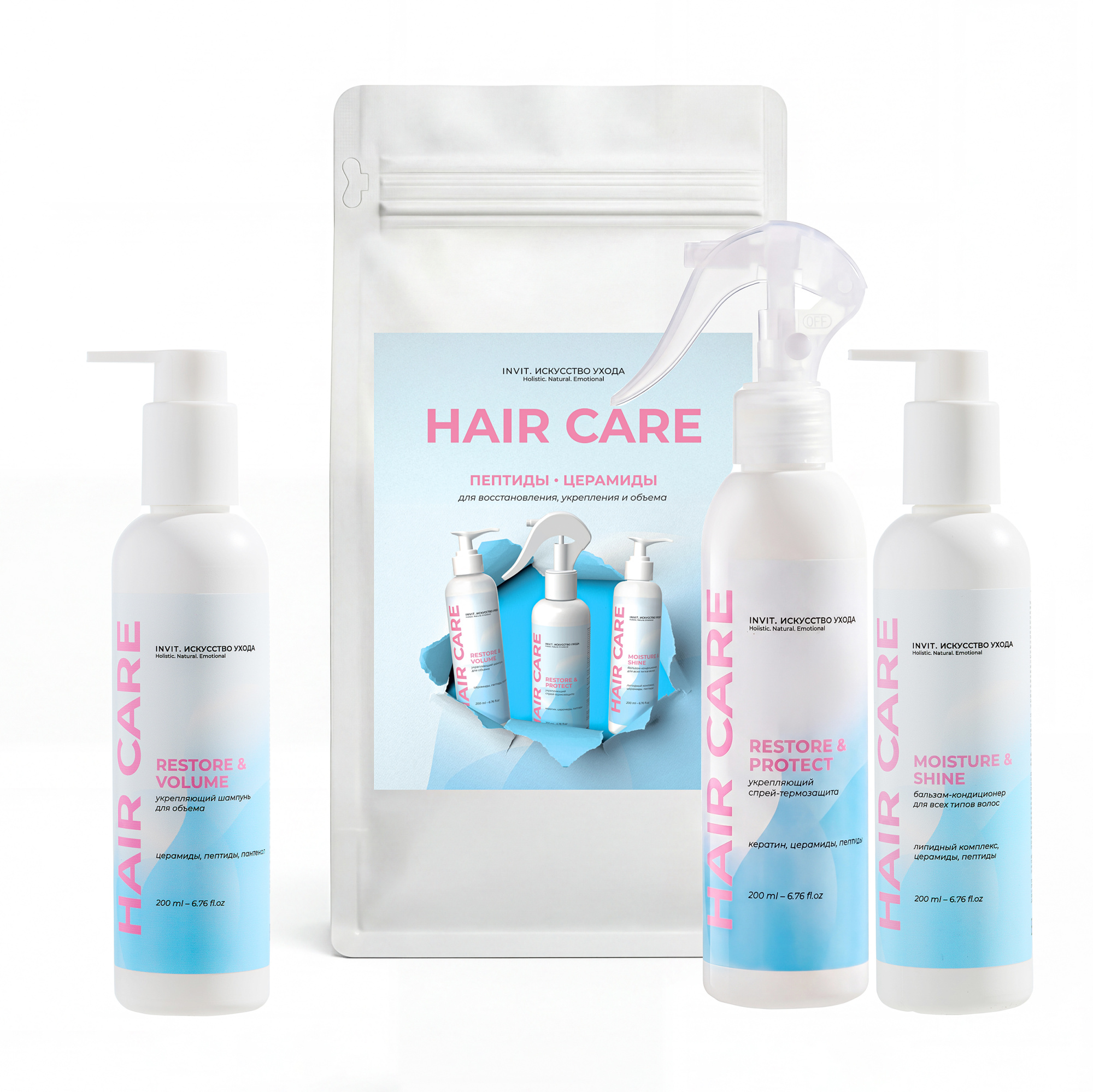 Набор для ухода за волосами: шампунь, бальзам и спрей-термозащита, 3×200 мл